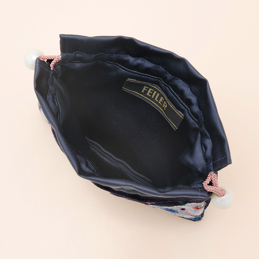 定番型の口元部分がサテンの巾着です。玉止めパーツはパール調で、巾着紐は少しラメの入ったものを使用しています。エレガントでドレッシーな雰囲気で、ギフトにもオススメです。リップやコンパクトなどのメイク小物などを入れて便利にお使いいただけるサイズ感です。