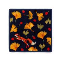 銀杏の葉と実が、秋の風にのって舞い踊っている様子を描いた新柄です。プロダクト用の生地には、シンプルな銀杏の葉と実だけでデザインをしています。ハンカチは、舞う銀杏と一緒に駆けまわったり実りの季節を楽しんでいるキツネさんを入れています。銀杏の実とお揃いの赤色ブーツを履いてオシャレをしているのがポイントです。表裏どちらも美しい発色をお楽しみいただけるシュニール織のハンカチは優しい肌触りで、吸水性もあり、ちょっとしたギフトにもおすすめです。