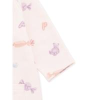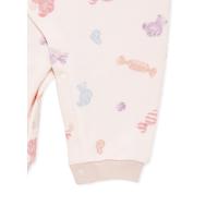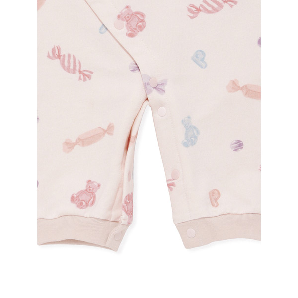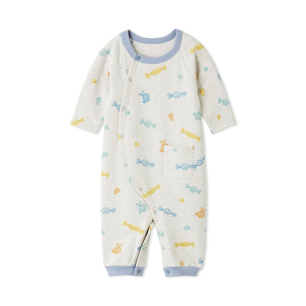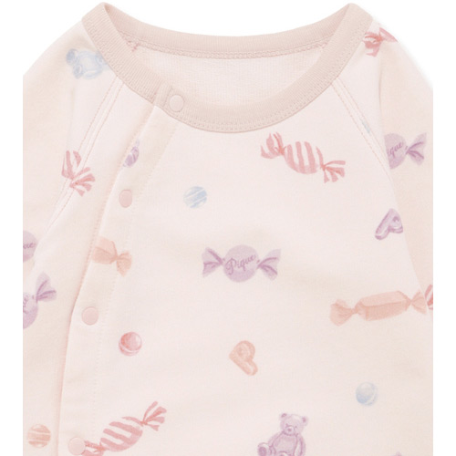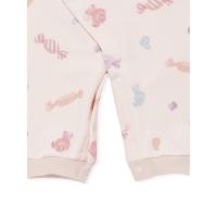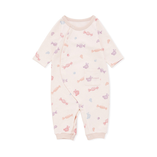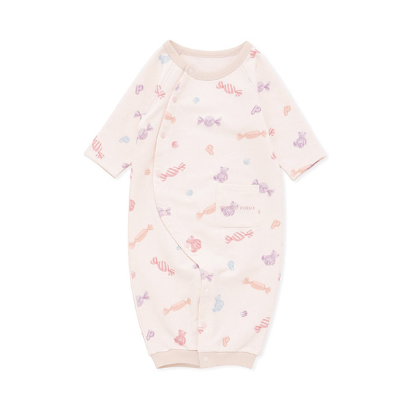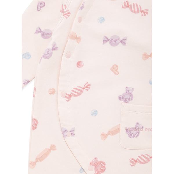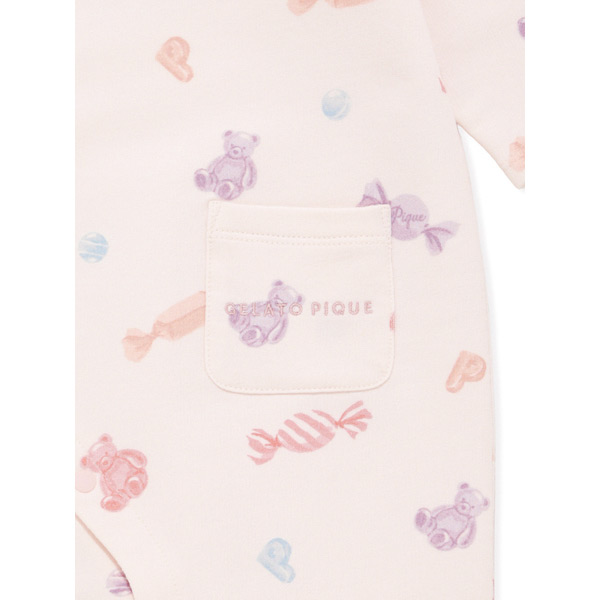 【Fabric】適度な厚みのあるコットン混のインレイ素材を使用しています。【Design/Styling】gelato piqueらしいベアやロゴモチーフのカラフルなキャンディを散りばめた、HAPPYな総柄プリントの2WAYオールです。程良くふっくらとしたコットン混のインレイ素材を使用し、ゆったりとしたラグランスリーブで動きやすく仕上げました。首元と足首の配色デザインと、フロントポケットに入れた刺しゅうがポイントです。色はピンクと杢グレーの2色をご用意。KIDSとのリンク・コーディネートを楽しんだり、同シリーズのBABY小物と組み合わせてギフトにもおすすめのアイテムです。