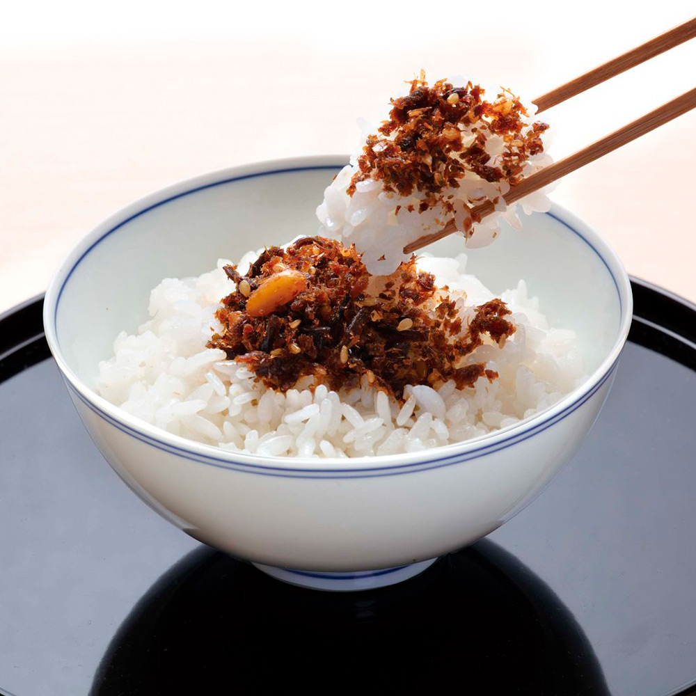 昭和7年に東京四谷左門町に創業。創業者の趣味であった盆栽から「錦松」と「梅」を取り「錦松梅」と名付け、ロゴマークには良い事が起こる前兆とされる鳳凰をデザインしました。鰹節を主原料に白胡麻、きくらげ、松の実など山海の素材を使用してしっとりとした風味に仕上げた「佃煮ふりかけ」です。温かいご飯にはもちろん、お茶漬け、おにぎり、納豆、玉子焼きなどでもお楽しみいただけます。人気の袋入り(90g)5袋をギフト箱に入れてお届けいたします。