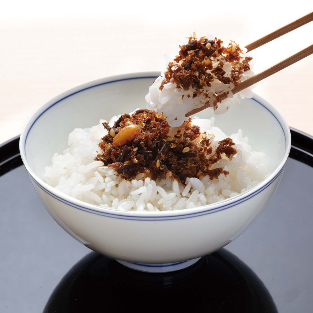 昭和7年に東京四谷左門町に創業。創業者の趣味であった盆栽から「錦松」と「梅」を取り「錦松梅」と名付け、ロゴマークには良い事が起こる前兆とされる鳳凰をデザインしました。鰹節を主原料に白胡麻、きくらげ、松の実など山海の素材を使用してしっとりとした風味に仕上げた「佃煮ふりかけ」です。温かいご飯にはもちろん、お茶漬け、おにぎり、納豆、玉子焼きなどでもお楽しみいただけます。人気の袋入り(130g)3袋をギフト箱に入れてお届けいたします。