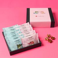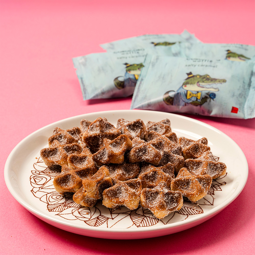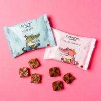 サクサク食感を食べきりで味わえるコロコロワッフル パックのアソートセット。シーズン限定の「ショコラストロベリー」と「ソルティキャラメル」の2種が味わえます。絵本作家 谷口智則氏によるピンクとブルーのデザインパッケージを並べると、バラを手にしたワニの夫婦が仲良く向き合って見えるほのぼのとした仕掛けも。ギフトや手土産はもちろん、シェアスイーツとしても使いやすい12袋セットです。