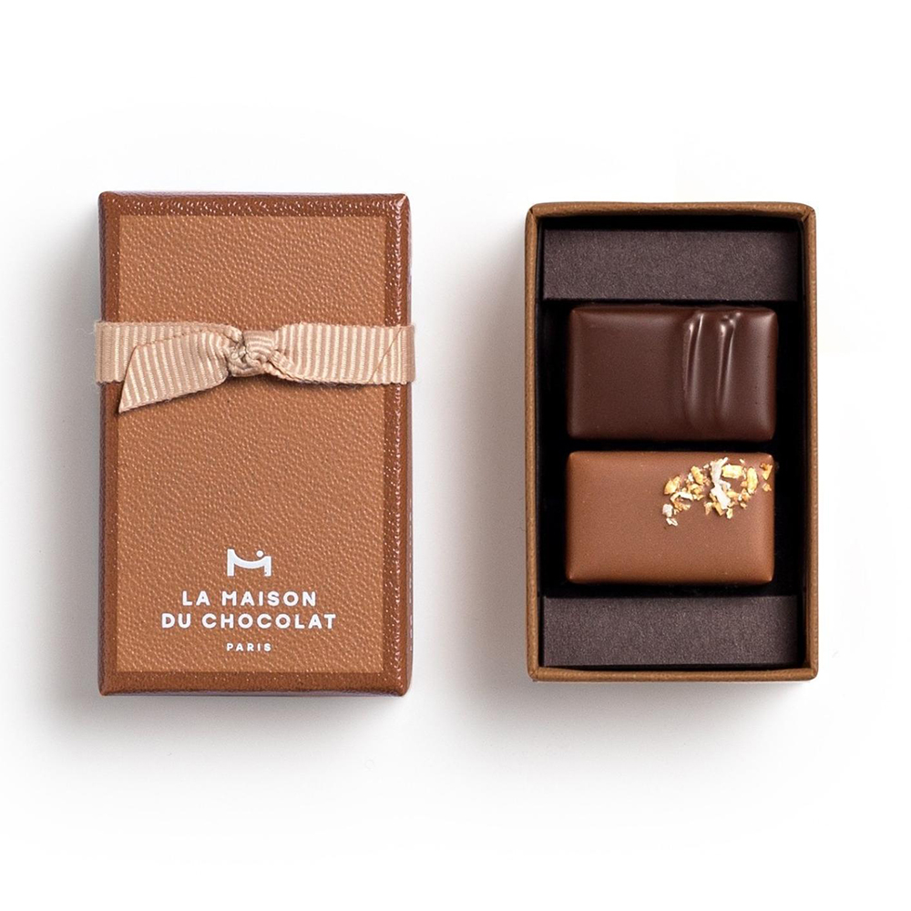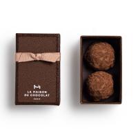 ラ・メゾン・デュ・ショコラを代表するアイコニックボックス「トリュフ2粒入」と、ナッツとショコラ「プラリネ2粒入」のセット