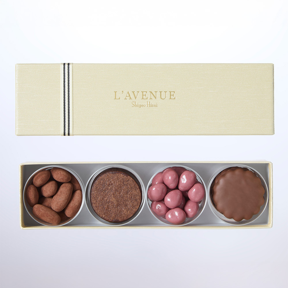 アマンドショコラ、サブレジャンドゥーヤフランボワーズ、レザンオソーテルヌルビー、スペキュロスショコラの詰め合わせ