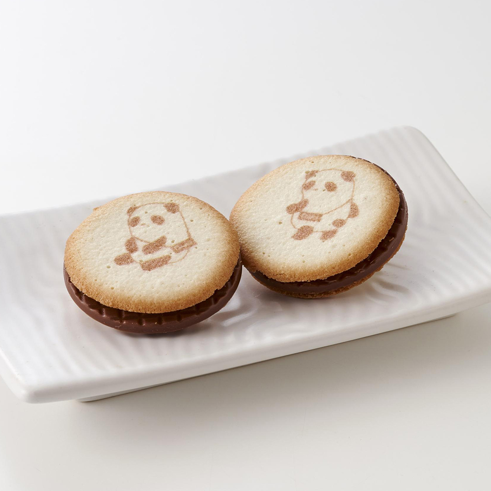 チョコプレートを、ホワイトクリームとラングドシャクッキーでサンドしました。ラングドシャにはパンダースの絵柄がプリントされています。