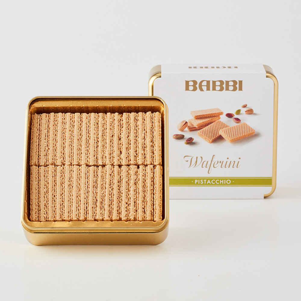 軽やかな食感と口どけを追い求めて完成したクリームサンド・ウエハース「ワッフェリーニ」。食べやすいサイズのウエハースにピスタチオクリームをサンドし、缶に詰め合わせました。専門店ならではの豊かな香りと上質な味わいをお楽しみいただけます。