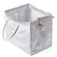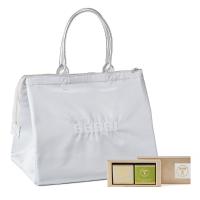 サテン素材を使用し、大きめのマチがポイントの保冷バッグです。日常のお買い物にも便利にお使いいただけます。軽い食感のクリームサンドウエハースをチョコレートで包んだ、冬の定番「ヴィエネッズィ」とのセットでお届けします。