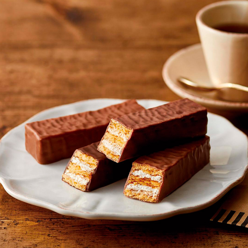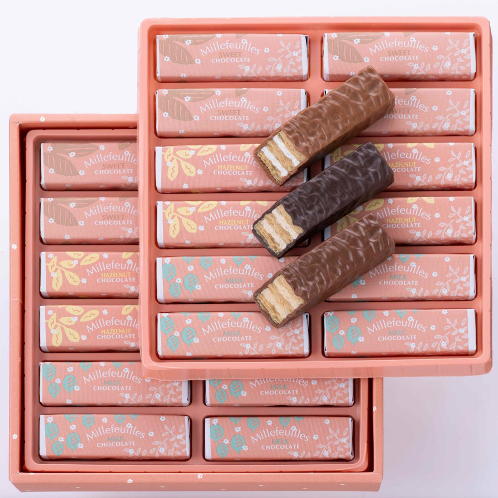 香ばしく焼いた3層のパイの間にリッチな味わいのクリームをサンドして、チョコレートで優しく包みました。ミルクチョコレート、スイートチョコレート、ヘーゼルナッツチョコレートの3つのおいしさをお楽しみください。