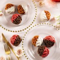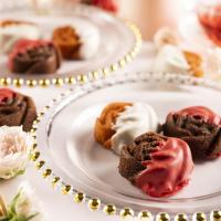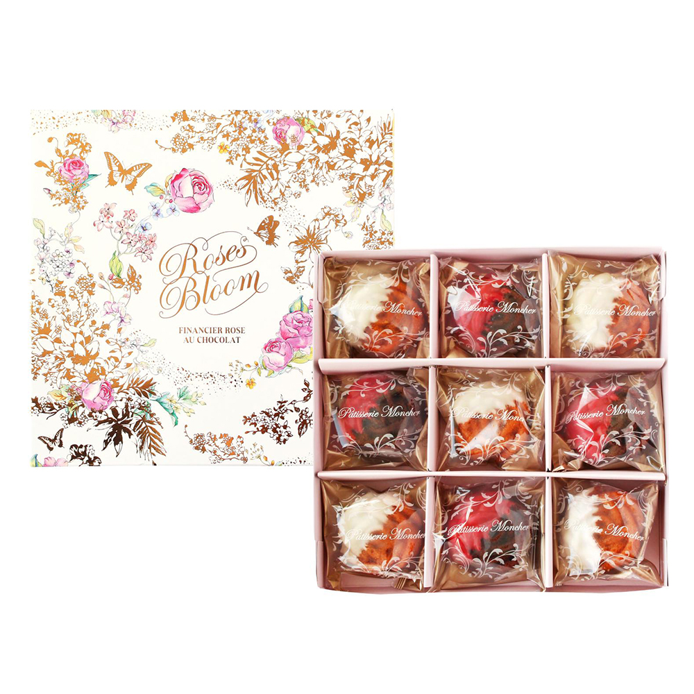くちどけなめらかなチョコレートでドレスアップしたバラのフィナンシェ。フランボワーズにはホワイトチョコ、ショコラにはいちご風味のチョコをまとわせました。