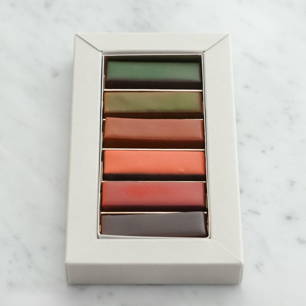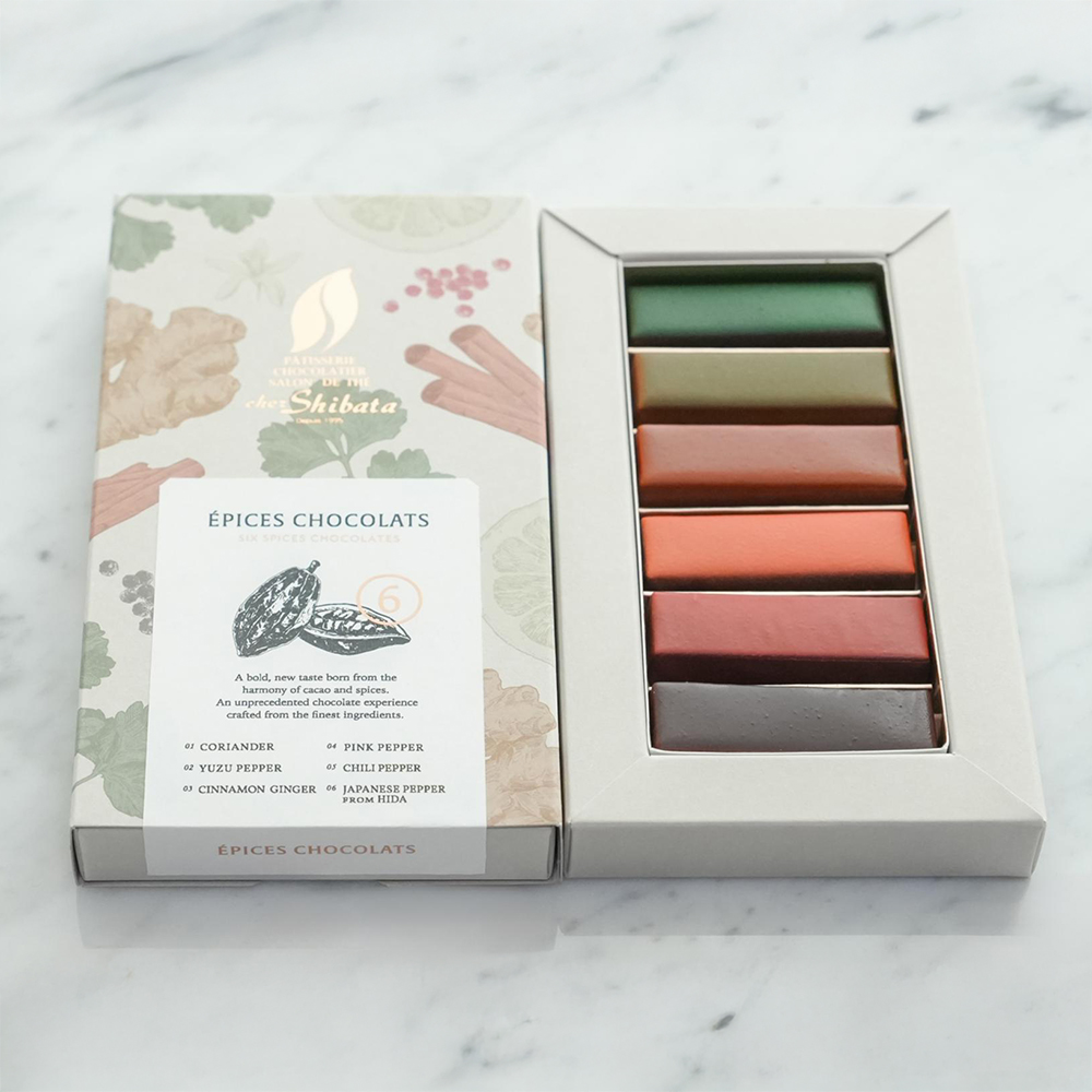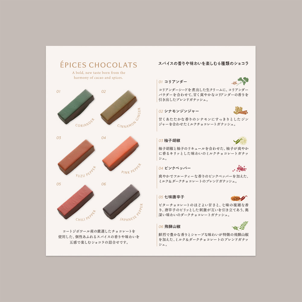 コートジボワール産のチョコレートを使用した、個性あふれるスパイスの香りや味わいを五感で楽しむショコラの詰合わせです。コリアンダー、柚子胡椒、シナモンジンジャー、ピンクペッパー、七味唐辛子、飛騨山椒の6種のフレーバーです。
