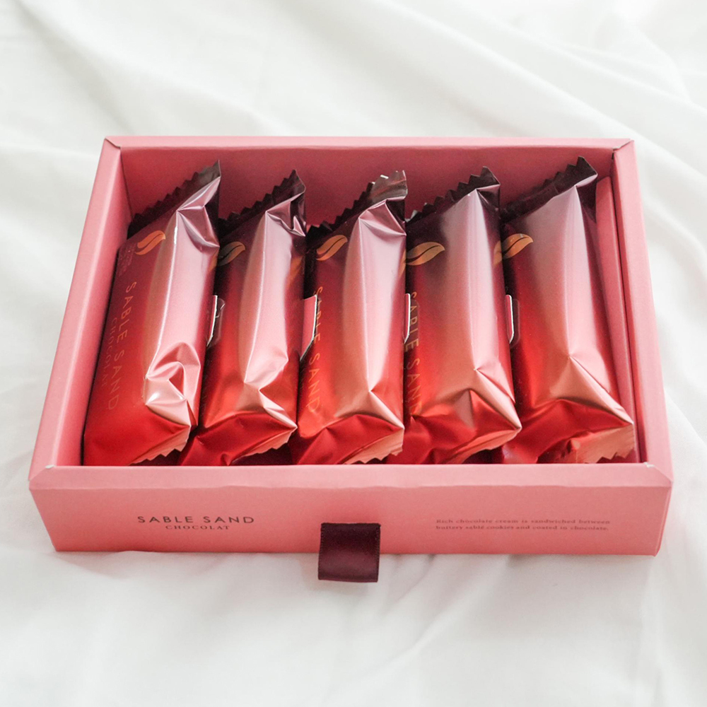 エクアドル産(※)カカオ豆を使用したチョコレートでコーティングしたバターサブレで、チョコレートクリームとカカオニブをサンドした、期間限定の特別なサブレサンド。 ※チョコレートに使用しているカカオマスのカカオ豆は100%エクアドル産です。