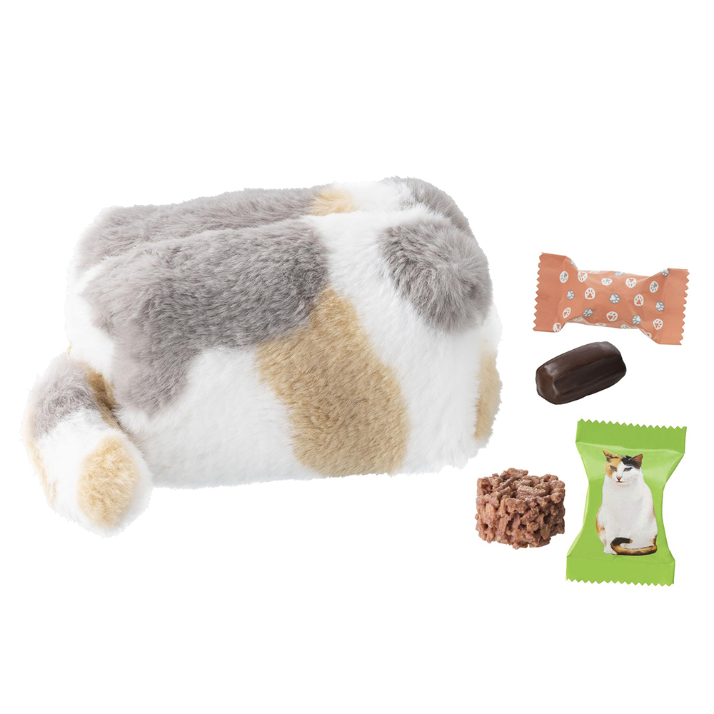 パステル三毛猫柄のポーチの中には、サクサク食感のストロベリークランチチョコレートとチョコレートクッキーが入っています。しっかり中身が入るポーチなので、食べた後も大活躍。