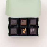 キャラメル・フルール・ド・セル・ベルモントエステート/F、ガナッシュ・フルール・ド・セル、プラリネ・ピスタチオ・ミルク、キャラメル・フランボワーズ・ベルモントエステート/F、ガナッシュ・テ・ベルガモット、プラリネ・ノワゼット・エデン/F 各1個 計6個入