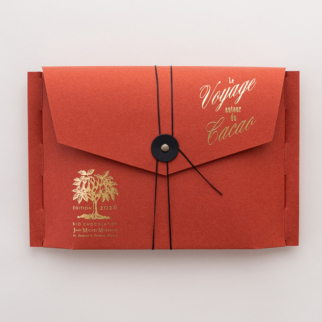 カカオ豆は、収穫時期・天候・土壌など、産地のあらゆる自然が映し出されます。たとえ同じ品種・産地のカカオを使っても、ショコラの香りや味わいは年ごとに変わり、ブドウとワインの関係のように毎年違う表情を愉しめます。収穫ごとに移りゆくカカオの個性を尊重するため、「ヴォヤージュ・デュ・カカオ」アソートは、世界7ヵ国から取り寄せたカカオを使用して8種のシングルオリジン(単一品種・産地)ガナッシュを詰め合わせました。ジャン=ミッシェル・モルトローが15年間徐々に取り組んだ直接農園から取り組んでいるドミニカ共和国エデン農園産カカオの含有量違いの70%、85%の食べ比べもお愉しみいただけます。カカオの個性をしっかり味わうことができるボンボンショコラです。さらに、カカオの素晴らしい魅力をより深く皆様に知っていただくために、各原産地の味わいの特徴をご紹介するテイスティングシートをお付けしています。旅のガイドとともにショコラを愉しむ旅にお出かけください。