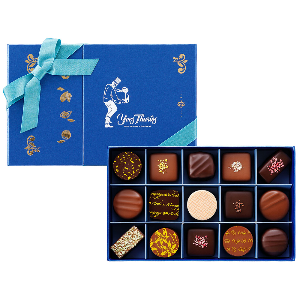 チョコレート15個入(プラリネ・ドゥ・シュド・ウエスト、フルール・ド・ヴァニーユ、ガナッシュ・ノワール、カフェ・マラゴジーペ、パレ・ティラミス、エクラ・ドゥ・ノワゼット、パリ・ブレスト、クール・パッション、エスプレット、バナン、フランボワジエ、シトロン・バジリク、ガナッシュ・テ・ジャスマン、パレ・カフェ、オランジュ)