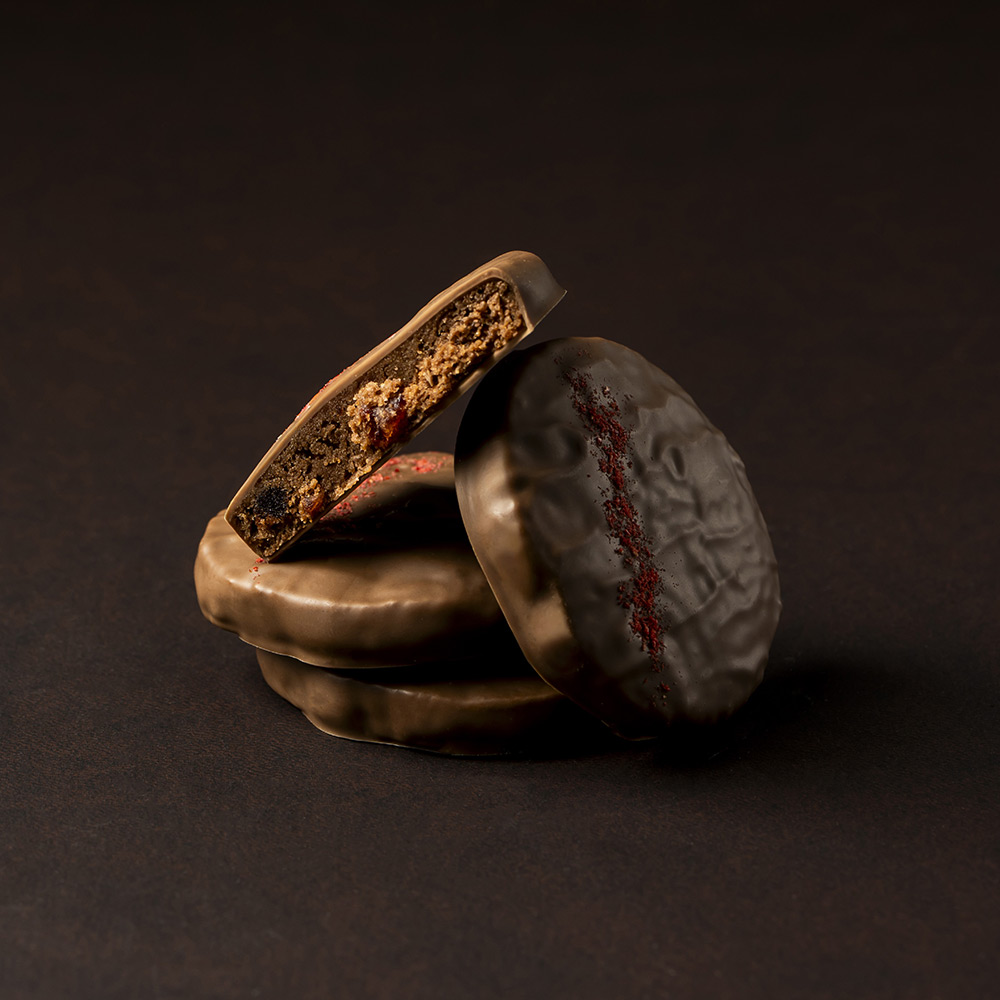 アーモンドプラリネを練り込んだサブレに、ホワイトチョコチップとセミドライ苺を合わせ、ミルクチョコレートで優雅にコーティング。プラリネのコク、ホワイトチョコの甘さ、苺の爽やかな酸味が重なり合い、華やかな余韻を描きます。焼き込むことでホワイトチョコがブロンズチョコのように香ばしく変化し、深みを増した味わいに。バレンタインの贈りものにも、ご家族や友人と分かち合うひとときにもふさわしい、フルーツとショコラが奏でる特別なサブレです。