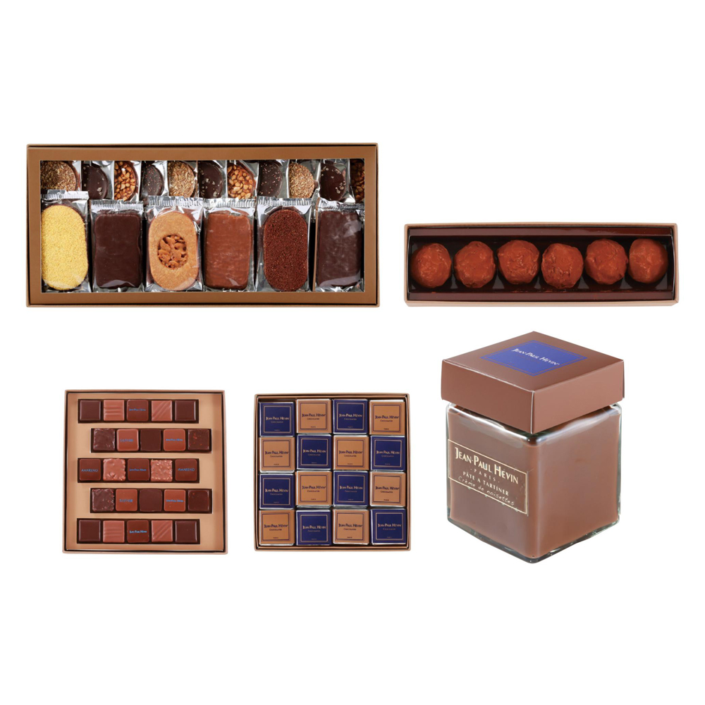 ボンボンショコラ(25個入)・トリュフ(6個入)・カレJPH(32枚入)・コフレゴホウビ(26枚入)・パットゥアタルティネノワゼット(ペースト)200g 各1