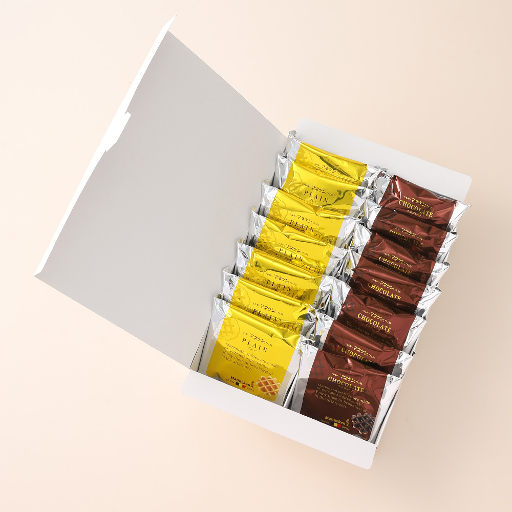 ベルギー伝統製法で焼き上げた定番のプレーンワッフルと、ナッツのような奥深い味わいが特徴のチョコレートをコーチングした冬季限定チョコレートワッフルの詰め合わせです。