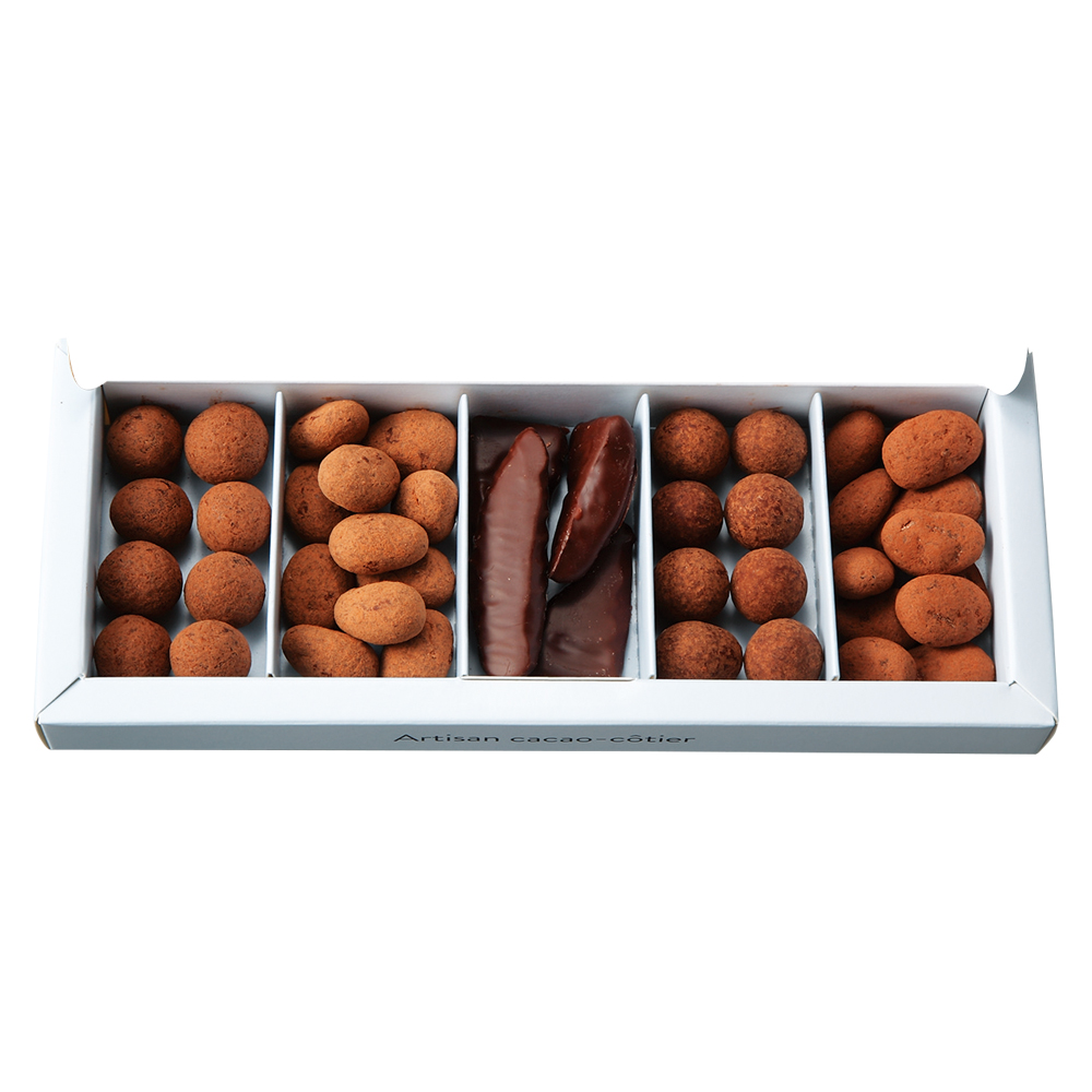 「ルトゥール・ド・プラージュ」とは、ビーチからの帰り道、という意味。海でたっぷり遊んだ後に食べるおやつをイメージし、お子様から大人まで、家族皆で楽しめる内容に。ピエモンテ産の最高級ノワゼットを丁寧にキャラメリゼしたミルクチョコ、ダークチョコでコーティングしたペルレ。コルシカ島のオレンジコンフィを使ったオランジェット。アーモンドをねっとりとしたショコラでコーティングしたガレ・イヨデのアソート。