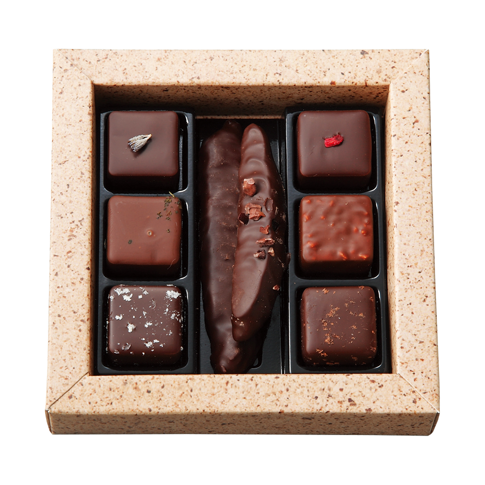 8種 計8個入[(1)2層・レモン&ジンジャーコンフィ×ラベンダープラリネ(ダーク) (2)2層・アプリコットコンフィ×レモンタイムプラリネ(ミルク) (3)ココナッツプラリネ(ダーク) (4)2層・ラズベリーコンフィ×ローズマリープラリネ(ダーク) (5)アーモンドプラリネ(ミルク) (6)セサミプラリネ(ダーク) (7)オレンジコンフィ(ダーク) (8)レモンコンフィカカオニブ付き(ダーク)]
