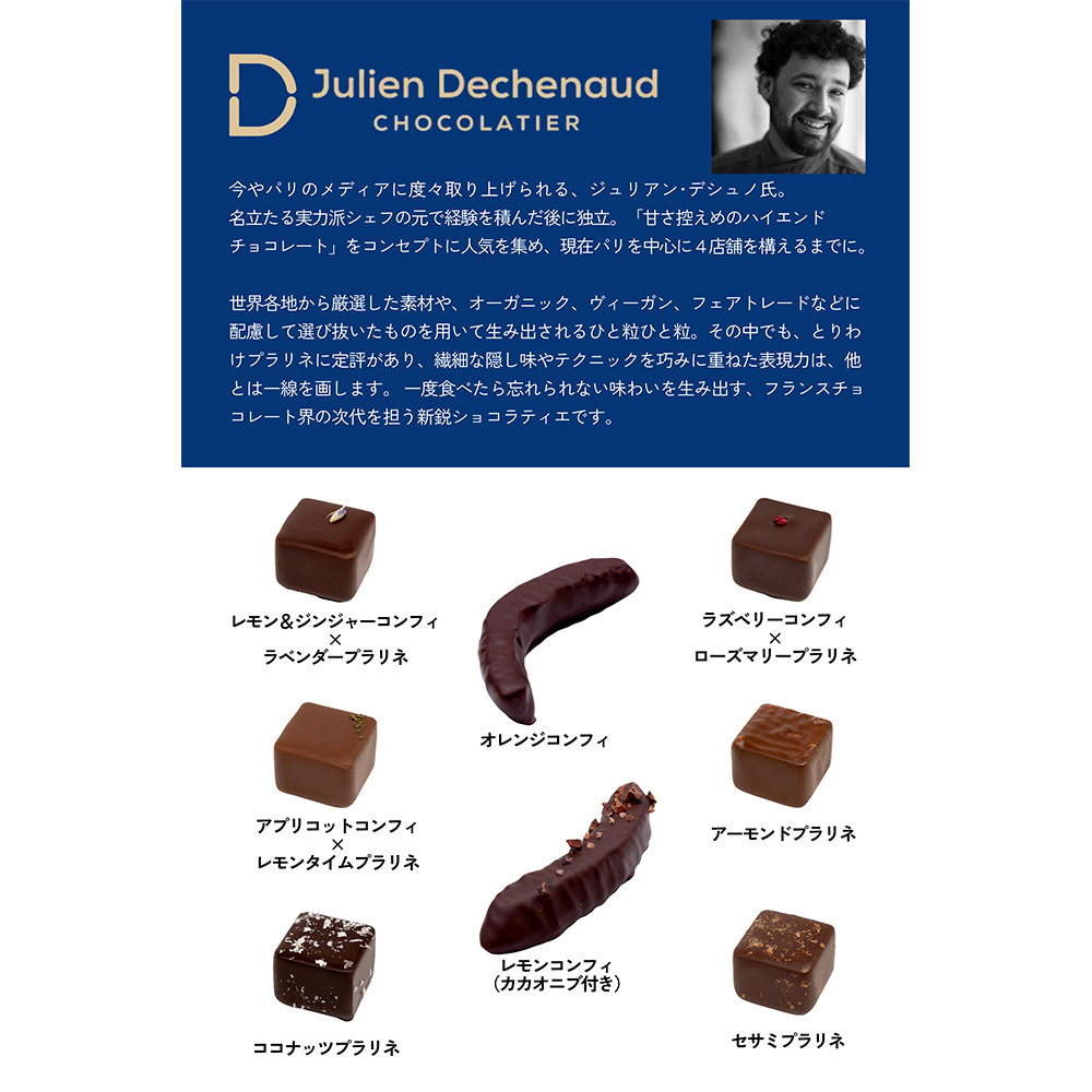 パリのメディアがこぞって注目する実力派ショコラティエ、ジュリアン・デシュノ氏。その卓越した技術とセンスが光るアソートが、今年も高島屋限定で登場。果実味溢れるラズベリーコンフィとローズマリーのプラリネが2層になったビークッシュや、カカオニブのほろ苦さとレモンの爽やかな酸味が調和したコンフィ。さらに、厳選された素材と独自の製法で深い味わいと美しさを兼ね備えた、氏の代名詞でもあるプラリネからはアーモンドなどをセレクト。多彩なフレーバーが詰まった、日常のひとときを特別な時間に変えてくれるような贅沢なひと箱。