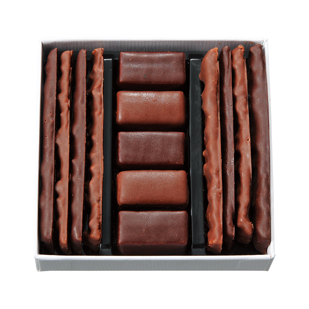 ダミアン氏の技が光る、あるようでなかったカリカリ、サクサクの食感と柔らかなテクスチャーを感じられる一度に二度美味しいショコラです。「レ・フィンガーズ」は、フルール・ド・セルを効かせたビスキュイ生地のプラリネに、ヴァニラをアクセントにしたギモーヴを乗せて、ミルクチョコ、ダークチョコでコーティング。「レ・アトラクションズ」は、ノワゼットヌガティーヌに焦がしバターのコクと塩味、ピエモンテ産ノワゼットのカリカリ感をとじこめミルクチョコ、ダークチョコでコーティング。1度食べたら手が止まらない美味しさです。