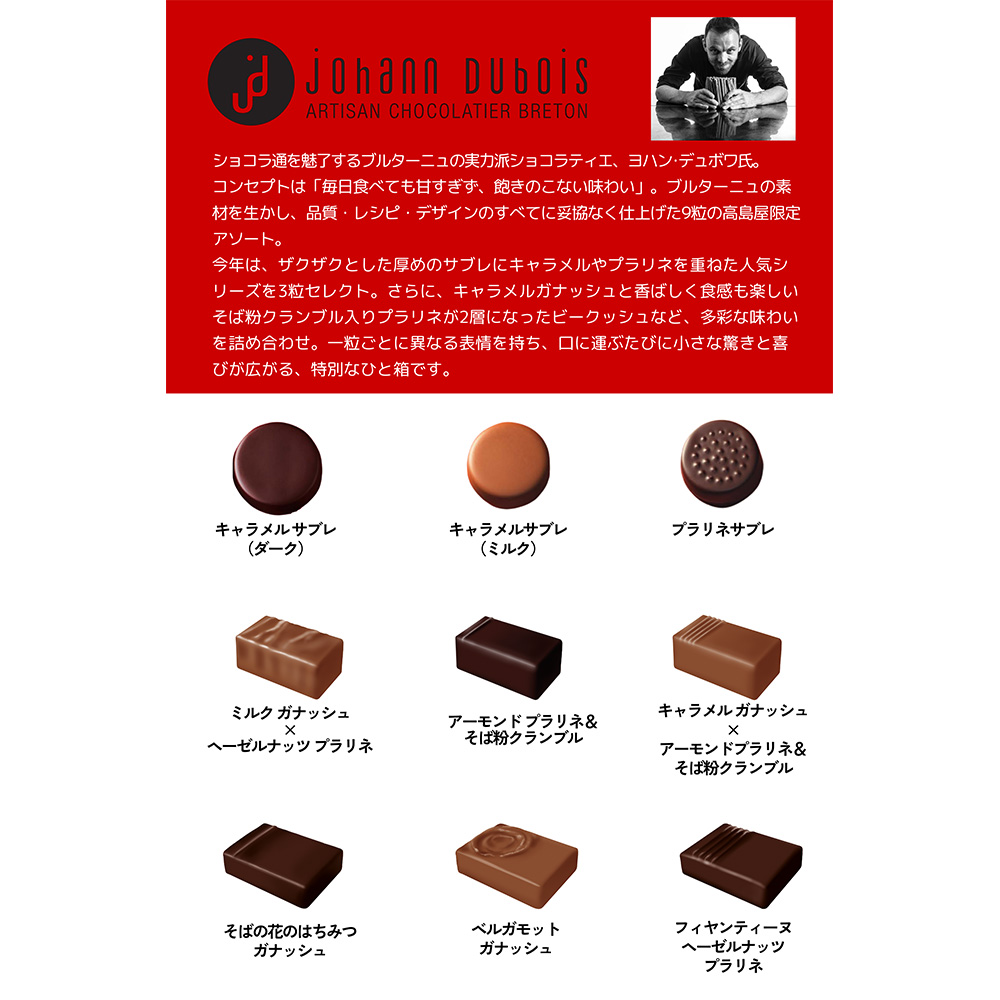 ショコラ通を魅了するブルターニュの実力派ショコラティエ、ヨハン・デュボワ氏。コンセプトは「毎日食べても甘すぎず、飽きのこない味わい」。彼が愛するブルターニュの素材を生かし、品質・レシピ・デザインに一切妥協せず仕上げた9粒の高島屋限定アソート。今年は、ザクザクとした厚めのサブレにキャラメルやプラリネを重ねた人気シリーズを3粒セレクト。さらに、キャラメルガナッシュと香ばしく食感も楽しいそば粉クランブル入りプラリネが2層になったビークッシュなど、多彩な味わいを詰め合わせ。一粒ごとに異なる表情を持ち、口に運ぶたびに小さな驚きと喜びが広がる、特別なひと箱です。