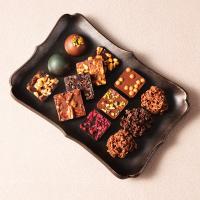 120g入[プラリネ(ミルク塩キャラメル、ミルクピスタチオ、ダークヘーゼルナッツ、ダークレッドベリー)、ドーム型プラリネ(ドバイエメラルドフレーキープラリネ、ドバイシャインフレーキープラリネ)、クロスティン(ダークオレンジピール、ミルク塩キャラメル)、クロッカント(ミルクヘーゼルナッツ、ミルクペカンナッツ、ダークヘーゼルナッツ、ダークカカオニブ)、フレーキープラリネパレット]