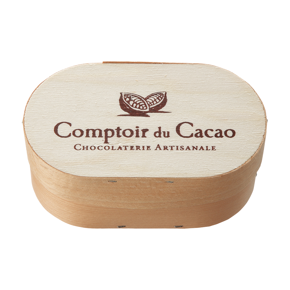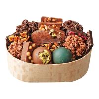 フランス・パリのサロン・デュ・ショコラにて、いくつもの賞を獲得したオリジナリティ溢れる品質の高いチョコレートを作る実力派ブランド。パリから1時間ほどの静かで美しい町にある鳥やリスなどが遊ぶ広大な敷地で結婚式場を営んでいたファミリーが結婚式で提供したチョコレートが大人気となり、チョコレートの製造を開始。パリに2店舗構えるショコラブランド。楕円形の木箱の中には、ソルトキャラメルやオレンジピールのクロスティン、ナッツたっぷりのフレーキープラリネ、そして新作のドバイエメラルドフレーキープラリネとピスタチオのドバイシャインフレーキープラリネを加えたアソート。