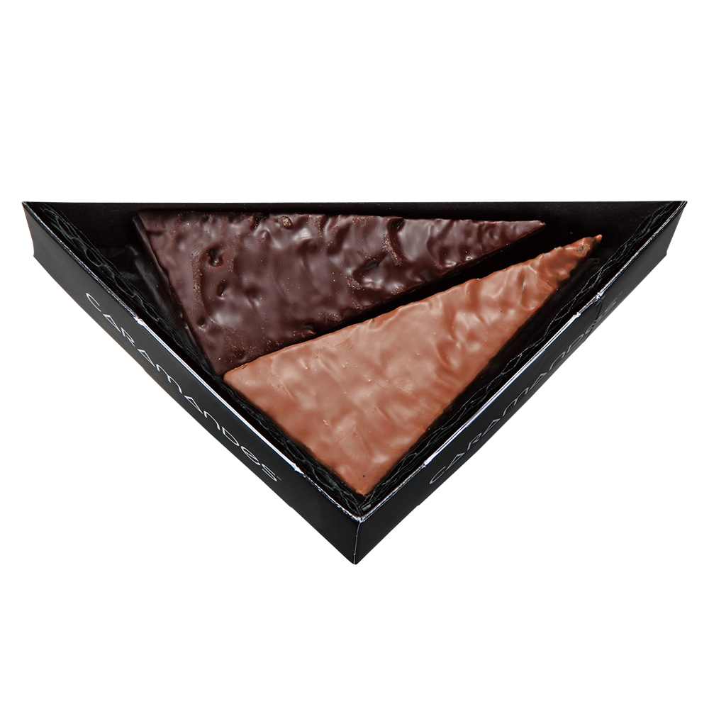 チョコレートをコーティングしたアーモンドスライスを三角形にカットしたアンヌ-フランソワーズ・ブノワのスペシャリテ「キャラモンド」