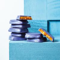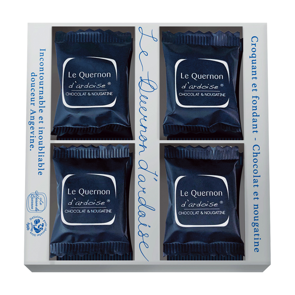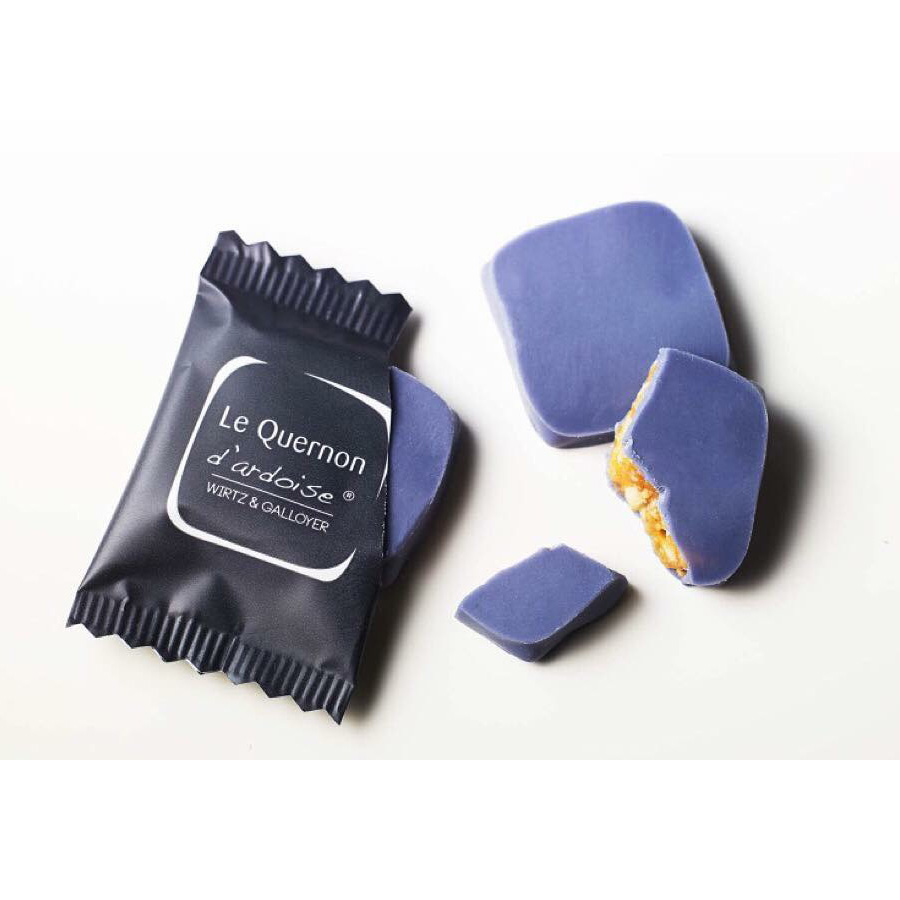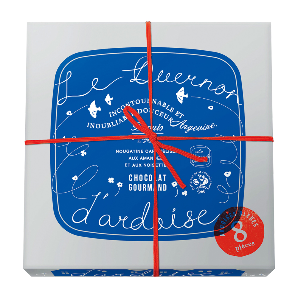 アーモンドとヘーゼルナッツのヌガティンを、鮮やかなブルーに色付けしたホワイトチョコレートで包んだ伝統菓子。その色と形は、フランス西部ロワール地方アンジェの名産、青い屋根瓦をモチーフにしています。1966年から守り続けられる独自のレシピと製法により、割るとカリッと心地よい音とともにナッツの豊かな風味が広がり、まろやかなチョコレートの甘みと絶妙に調和します。今年もかわいい高島屋限定パッケージでお届け。