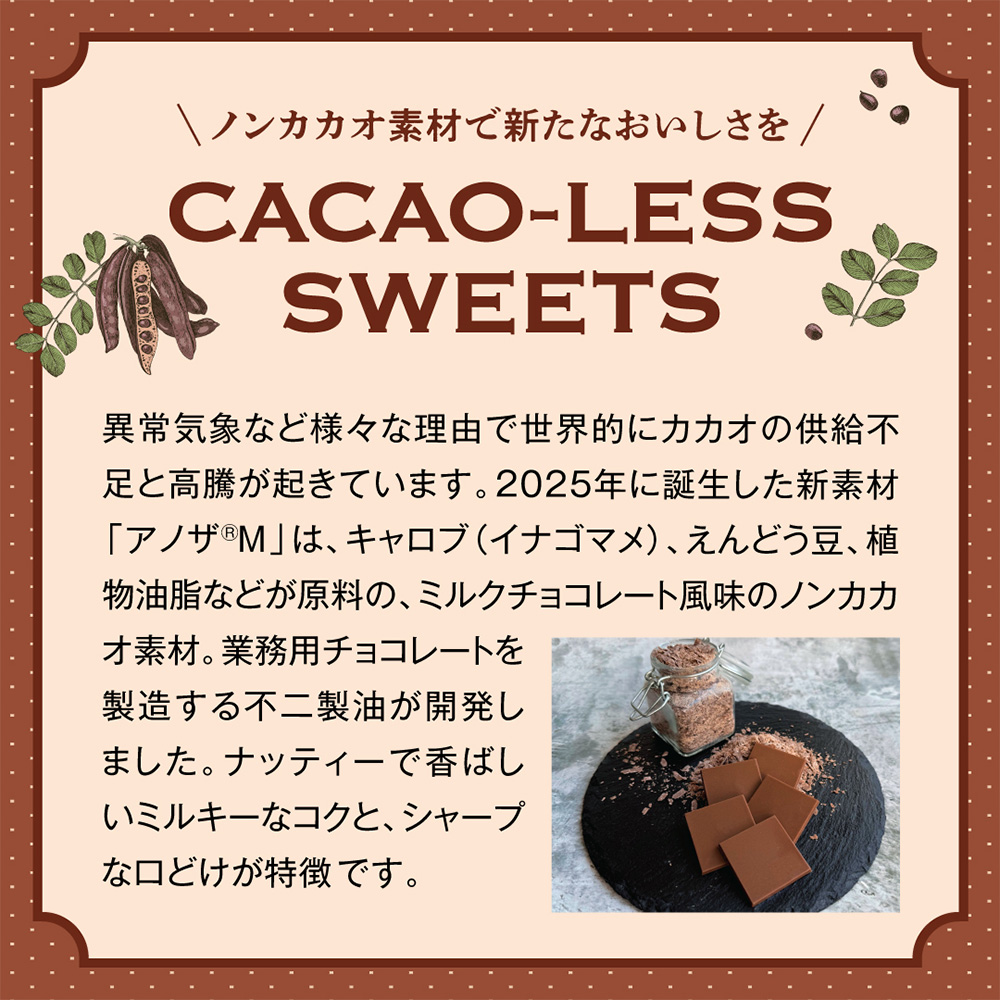 <CACAO-LESS SWEETS>カカオ豆の供給不足に対する取り組みの一つに、代替カカオがあります。2025年に誕生した新素材「アノザM」を使い、ショコラのような豊かな味わいのスウィーツを新たに生み出しました。