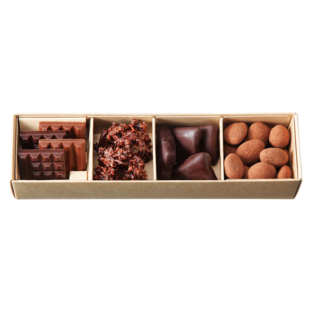 ル・ショコラ・アラン・デュカス自慢のショコラ4種:ドラジェ、オランジェット、ミニタブレット、ロックのアソート。カカオの風味際立つショコラをバラエティ豊かに楽しめるバレンタイン限定BOXです。