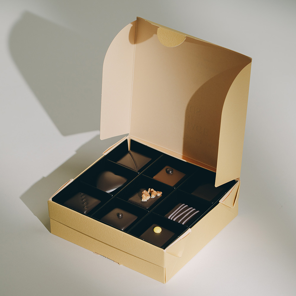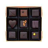 9種計9個入(キャラメル・フルール・ド・セル・ベルモントエステート/F、ガナッシュ・フルール・ド・セル、プラリネ・ピスタチオ・ミルク、ローズ・クール・ダーク、キャラメル・フランボワーズ・ベルモントエステート/F、ガナッシュ・テ・ベルガモット、プラリネ・ノワゼット・エデン/F、キャラメルマンゴー&パッション・ベルモントエステート/F、ガナッシュ・カフェ)