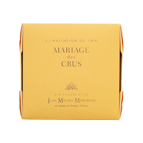 マリアージュとは、2種以上の素材を組み合わせた時に、お互いの味や風味、香りなどに相乗効果がはたらき、最高に相性が良く、美味しい調和を生み出す関係のことです。カカオには、品種や産地によって香りや風味にさまざまな個性があります。「マリアージュ・デ・クル 」アソートは、ドミニカ共和国・ペルー・グレナダ・ブラジルの4カ国のカカオがそれぞれ持つ、酸味や苦みなどの個性を引き出しながら、ガナッシュ・キャラメル・プラリネをベースとしたフィリングとのマリアージュを追求しました。ブランドを代表する希少な一番塩を使用したガナッシュやキャラメル、ロースト加減にもこだわった格調高い香りや濃厚な風味のナッツのプラリネに加え、ドイツ産のバラを贅沢に使用したハートのローズショコラの華やかなアロマも愉しめます。ペルー産カカオには、豊かな香りのベルガモットティーのガナッシュを合わせて、グレナダ・ベルモントエステート産カカオにはキャラメルフランボワーズや瑞々しいマンゴーパッションの味わい、JMMのパートナー農園であるドミニカ共和国・エデン農園のカカオにはヘーゼルナッツプラリネを合わせ、ブラジル産カカオには、好相性のコーヒーのガナッシュを合わせました。各産地のカカオの個性とマリアージュを存分に愉しめる一箱です。