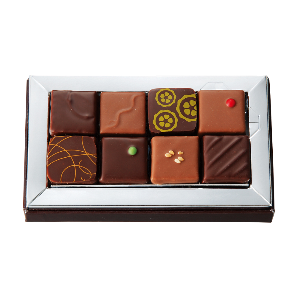 8種計8個入(フリュイルージュ テノワール、カルヴァドス カネル、アメール、フランボワーズ マント、スリーズ ロマラン、カフェノワール、プラリネ ヌガティーヌ、プラリネ セザム)