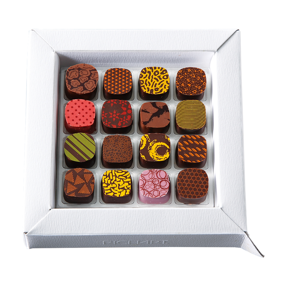 16個入(トンカ豆ガナシュ、マダガスカルチョコレート、ベネズエラチョコレート、マダガスカルバニラ、ローストアーモンド、ヘーゼルナッツ、ごま、フレッシュミント、ピンク&レッドペッパー、塩バターキャラメル、ストロベリー、マンゴー&パッションフルーツ、ネロリオレンジブロッサム、ライム、グレープフルーツ、ゆず)