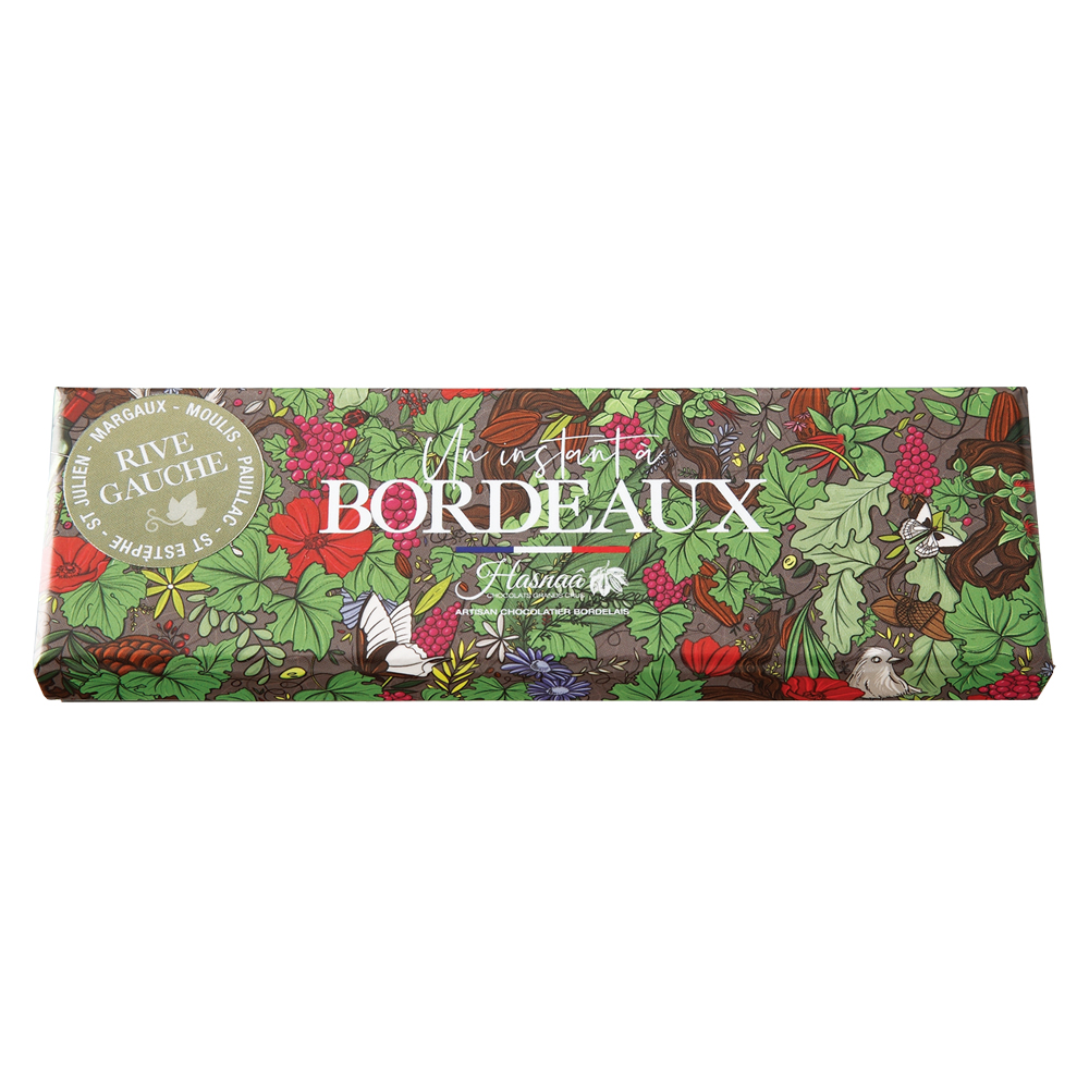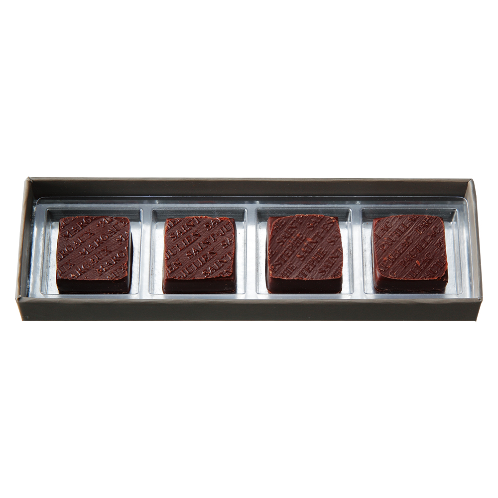 グラン・クリュに格付けされたボルドーワインの澱をショコラに仕立てた香り豊かなガナッシュ。ワインとショコラの異なるテロワールが紡ぐ逸品です。ボルドーを貫く大河・ジロンド河をはさんで左岸(Rive Gauche:リーヴ・ゴーシュ)で栽培されるブドウはさっぱりとドライな風味が持ち味。4つのシャトーが作るワインの味わいは同じ左岸でもそれぞれ異なり、その微妙な違いが4粒のショコラに結実し一箱に並んでいます。世界でもアスナにしか作れない、貴重なワインガナッシュです。マルゴー(Margaux):Chateau Marquis de Terme、サン・ジュリアン(Saint-Julien):Chateau Leoville Poyferre、ポイヤック (Pauillac):Chateau Pedesclaux、サン・テステフ(Saint-Estephe): Chateau Le Crock