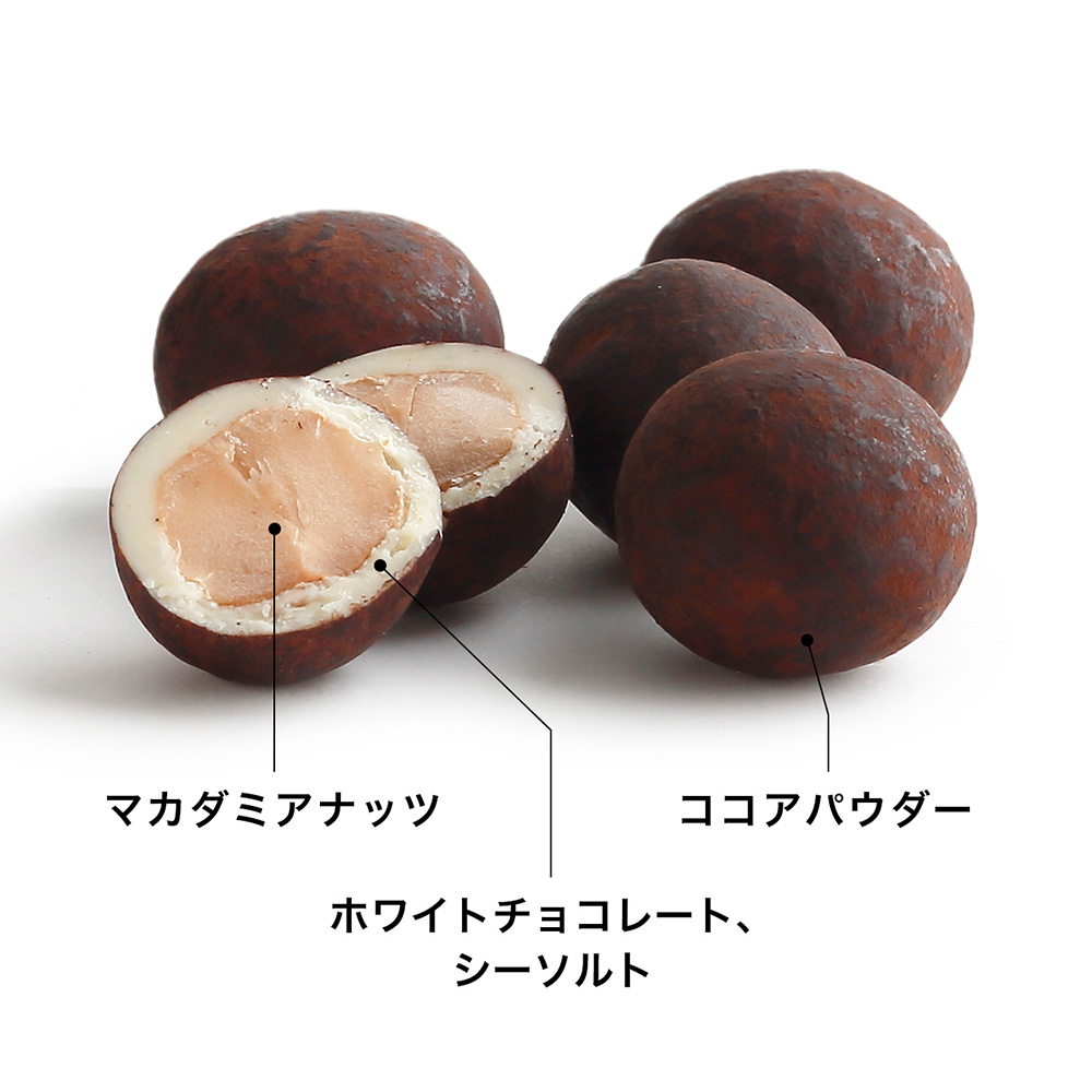 ブランド人気No.1。大粒のマカダミアナッツを、バニラの香り立つホワイトチョコレートでコーティングし、ココアパウダーで仕上げました。アクセントにシーソルトを効かせたホワイトチョコレートと、香ばしいマカダミアナッツが絶妙なハーモニーを奏でます。満足感のある一粒は、食べたらやみつきになる逸品。インターナショナルチョコレートアワード2020銀賞を受賞した商品です。