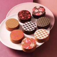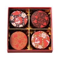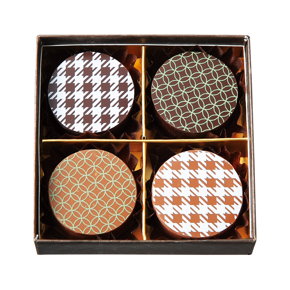 苺と木苺入りプラリネ(ビター・ミルク)、ドライカシス入りプラリネ(ビター・ミルク)、ほうじ茶プラリネにマロングラッセ(ビター・ミルク)、黒豆きな粉プラリネにマロングラッセ(ミルク・ビター)