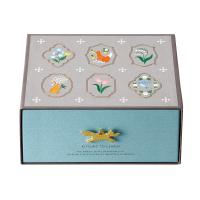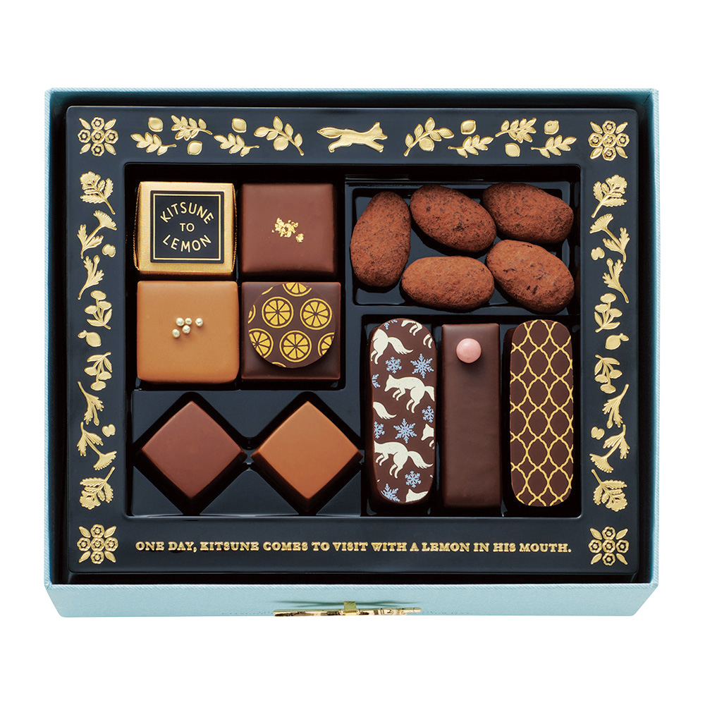 キツネとレモンのすべてのお話を味わえる特別なアソート。今年は、オリジナル「レモンをくわえてやってきたキツネ」型のチャームが付いた、新たなパッケージで新登場。キラキラ光るキツネ型チャームが楽しそうに遊ぶ、「深引出し」タイプのボックスです。後使いや飾って眺めても楽しい一品です。今年は、雪夜のオーロラカーテン(塩キャラメル)、とろける砂漠(キャラメル)が新たにアソート。そのほか、オリジナルストーリーからは、まろやかな口どけのキツネ型チョコレート(スイート、ミルク)をはじめ、黄金の実(レモン)、野うさぎの赤い実(いちご)、ハンサムな馬の葉っぱ(レモングラスフレーバー)、森のくまの蜂蜜(レモンの花蜂蜜)など、オオカミシリーズからはイチゴ畑をわたる風(ストロベリーシャンパン)がお楽しみいただけます。<ブランド説明>「あるときキツネがレモンをくわえてやってきた」すっぱいもの好きの、ちょっと変わったキツネが届けるキュンととろける甘酸っぱさ。心を明るく灯す、黄金の実「レモン」にまつわるお菓子。