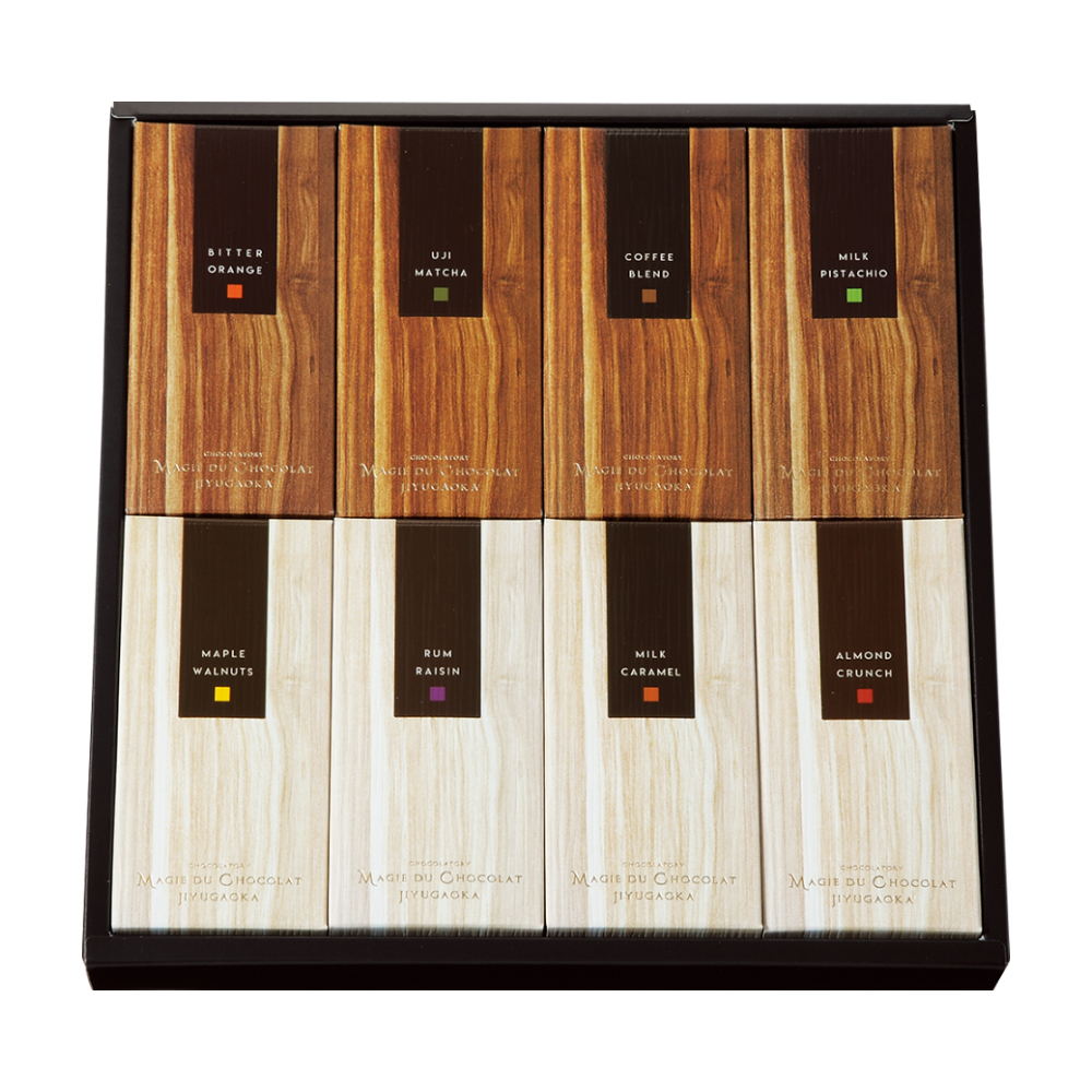 アーモンドクランチ、ミルクピスターシュ、ミルクキャラメル、コーヒーブレンド、ラムレーズン、宇治抹茶、メープルウォルナッツ、ビターオレンジ 各1個