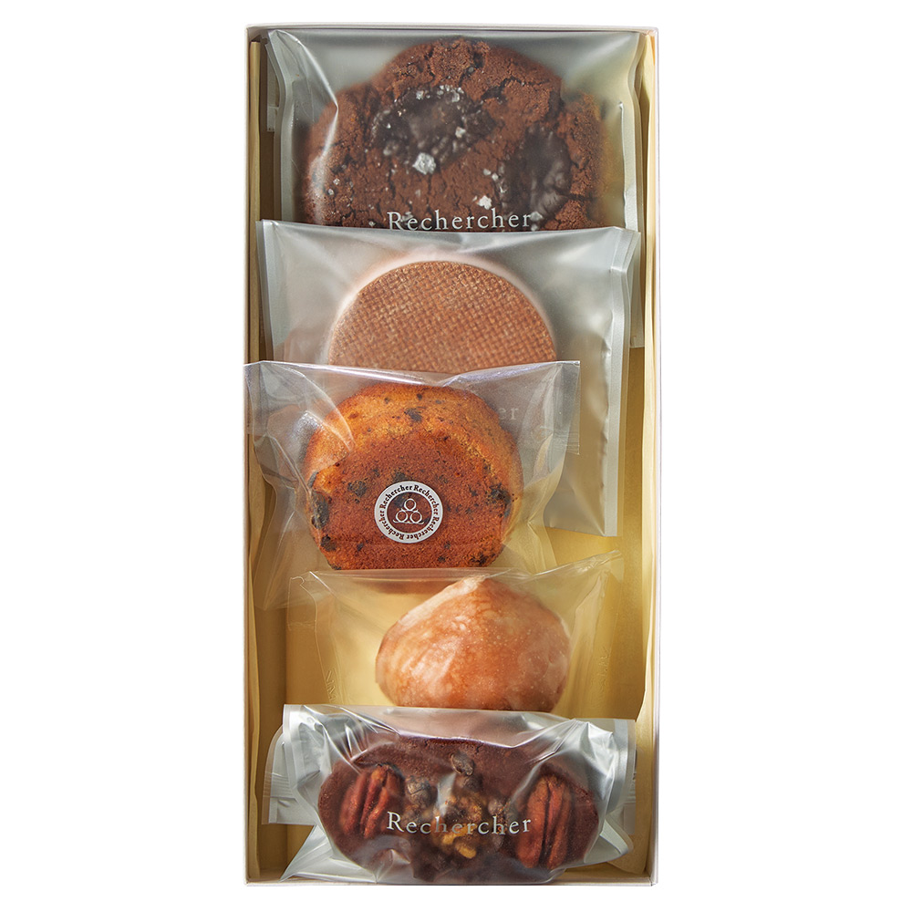 フランス語で“探求”を意味する店名の通り、さまざまな素材を使ったスウィーツ作りを得意とするパティスリーから焼菓子詰め合わせが到着。チャンククッキーやマロンケーキ、ブラウニーなど、人気の5種の味わいをどうぞ。