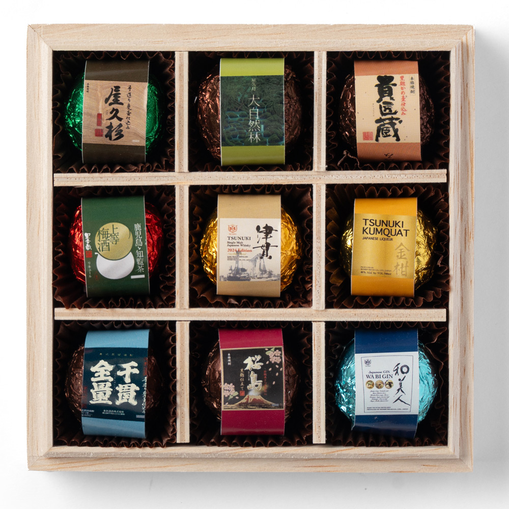 鹿児島県本坊酒造の厳選9銘柄を詰め込んだボンボンショコラ。焼酎を初め薩摩半島南西にある津貫蒸留所で造られたウイスキー等様々な味わいが1箱で楽しめるセット。