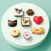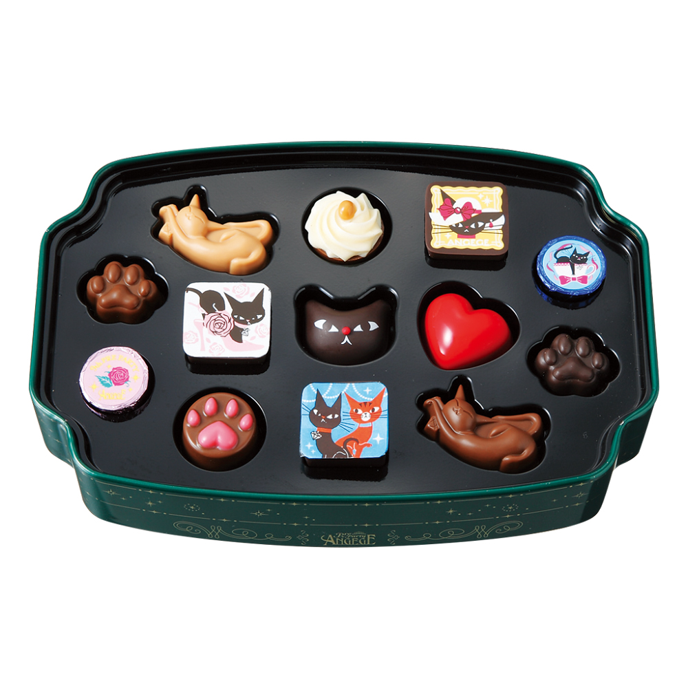2026年の限定缶は、パーティー会場でポーズをとるアンジュジュたちのイラスト。猫型や肉球型など猫好きにはたまらないチョコレートが勢揃いです。