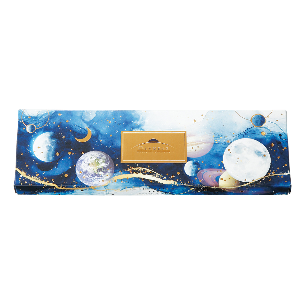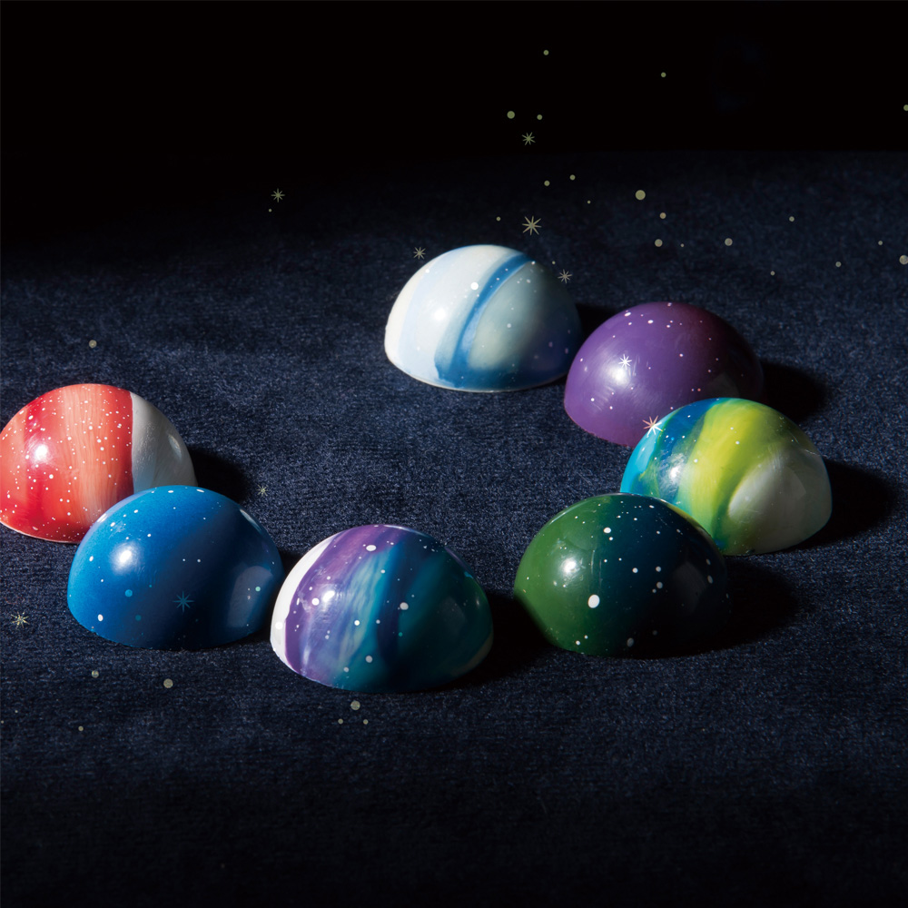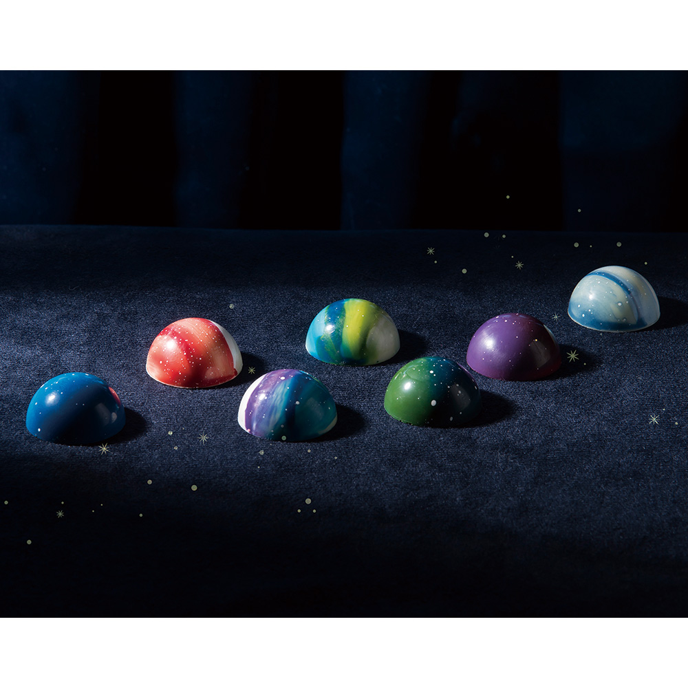 太陽系の惑星をイメージした鮮やかなショコラを詰め合わせました。惑星ごとに異なる、様々な味のアソート。滑らかなキャラメルソース入りやガナッシュ入りのショコラが楽しめます。遥か彼方にある惑星に思いを馳せてお召し上がりください。