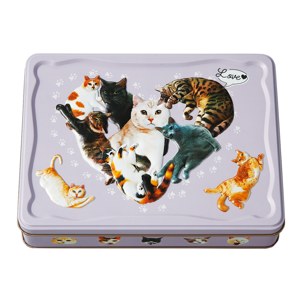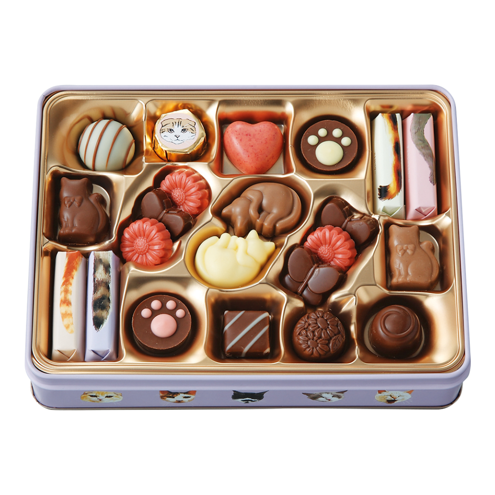 丸まってお昼寝している猫ちゃんや肉球などのかわいらしいチョコレートがいっぱい。いろいろな味を詰め合わせた心躍るアソートになっています。自分用にもギフト用にもおすすめの商品です。