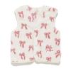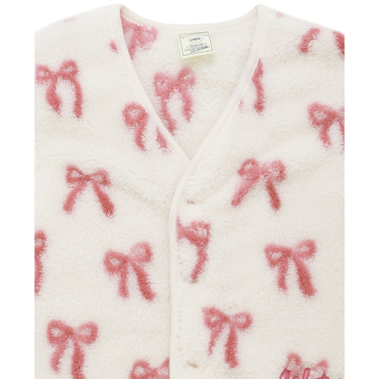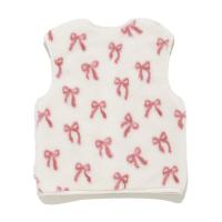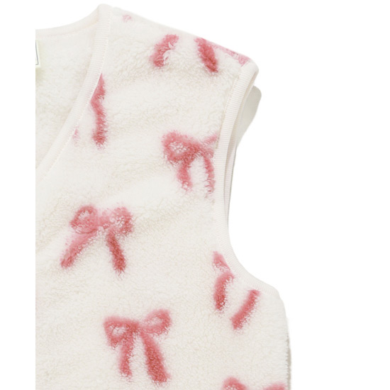 [Fabric]柔らかいフリース素材を使用しています。[Design/Styling]リボン、クルマ。子どもたちがときめくモチーフをあしらった、ギフトにもおすすめしたいKIDSシリーズです。ふっくら温かな風合いのフリース素材を使用した、お外にも着用していただけるベスト。汗をかきやすいお子様でも温度調整をしやすく、動きやすい羽織りです。スナップボタンでさっと着脱可能で、左腰にロゴ刺しゅうも入れました。色はリボン柄のピンク、クルマ柄のブルーの2色展開。同シリーズのアップリケパンツやワンポイントプルオーバー、小物類を合わせたり、BABYサイズとのリンク・コーディネートもお楽しみいただけます。