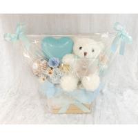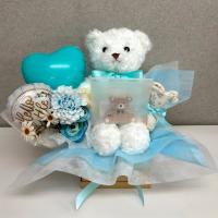 歯固めやガーゼミニタオルといった実用ギフトと一緒に、ぬいぐるみを赤ちゃんのファーストトイとしても贈れるダイパーケーキセットです。
