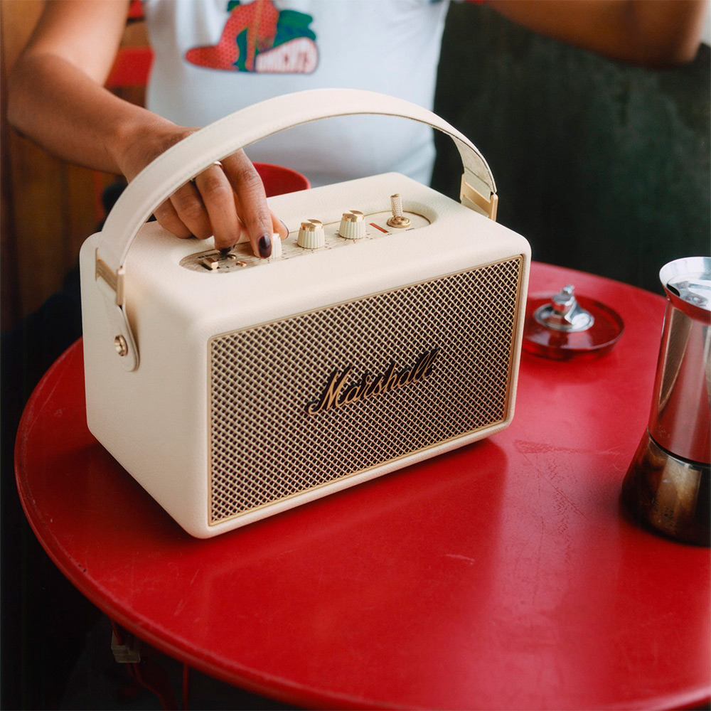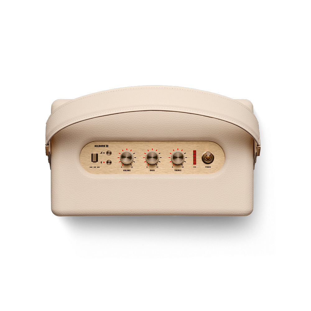 Kilburn IIIは、Marshall 独自のマルチディレクショナル(全方位)サウンドの採用により、どこから聞いても迫力のあるサウンドが360度体感できたり、低音から高音までどんな音量でもバランスのとれた音で再生できるなど、あらゆる面で Marshall のこだわりが実現されています。またデザイン面においても細部までの工夫が施されており、自社のアンプやロックンロールの歴史にインスパイアされたクラシックな外観を踏襲しています。ベルベット縁のストラップやロータリーノブなどは、どのような場面にもきれいにフィットする定番なデザインとなっています。コードや電源を気にすることなく持ち運びできるほか、IP54の防水/防塵対応により屋内でも屋外でも、「Kilburn III」があればお気に入りのプレイリストをどこでも再生できます。